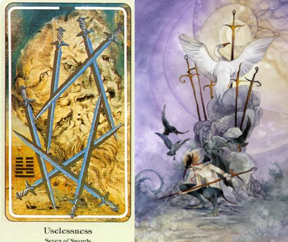 The Haindl deck has a very different message from the traditional sense of the 7 of swords. The (real or perceived) lack of power is quite different than the misuse of some powers. Though the misuse of power could theoretically point to the perceived lack of meaningful power. If a man can’t pay to feed his family, he will steal. If a man does not feel confident around women, he will find ways to manipulate and misrepresent himself. If a man knows his station or services aren’t needed, he may strive in politics to corrupt the system in his favor. You could say in the case of the Haindl Tarot, there is one less abstraction as it focuses on the invisible (feeling of inadequacy) versus the visible result (shortcuts, immorality.)