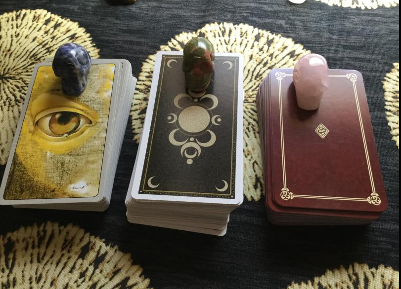 From left to right, the skulls are as followed – Sodalite, Unakite, and Rose Quartz. We are using the Haindl Tarot, Deviant Moons Tarot, and the Celtic Tarot.