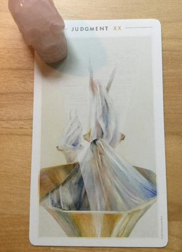 Rose quartz is paired here with the Judgement card from the Fountain Tarot.