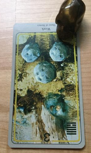 This Tigers Eye skull is paired with the Three of Stones reversed from the Haindl Tarot. It seems there is currently some difficulty making your goals manifest. Perhaps all the little things are piling up, now taking real estate in your head making you anxious to act. Be assured that you have the assistance and luck you need here to accomplish your goals. The only thing stopping you is yourself.